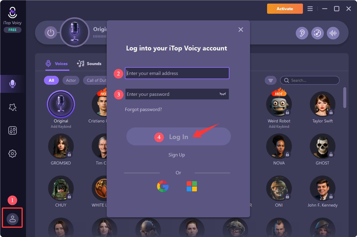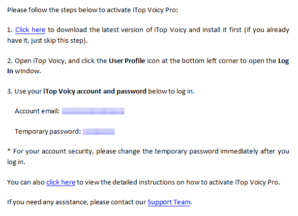 You will be emailed with your account and a temporary password after the purchase, just like the picture below. Please follow the guidance in the email to activate iTop Voicy Pro.
